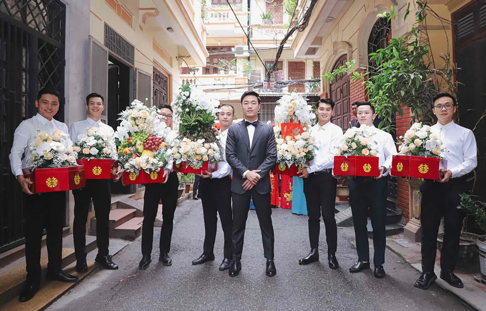 Đội hình bưng tráp: Nhà trai thường chọn nam thanh niên độc thân, nhà gái chọn nữ chưa chồng để nhận tráp.